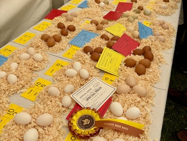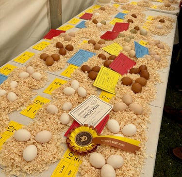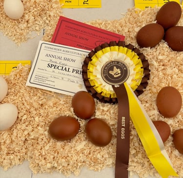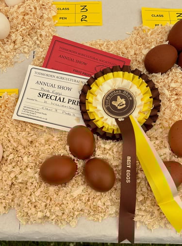 Thanks to Christine Harrison and her husband for hosting an egg show. Its our first time at Todmorden, the sun was shinning, we had great fun with Oscar the pooch and drove home with this years top egg prize and trophy.